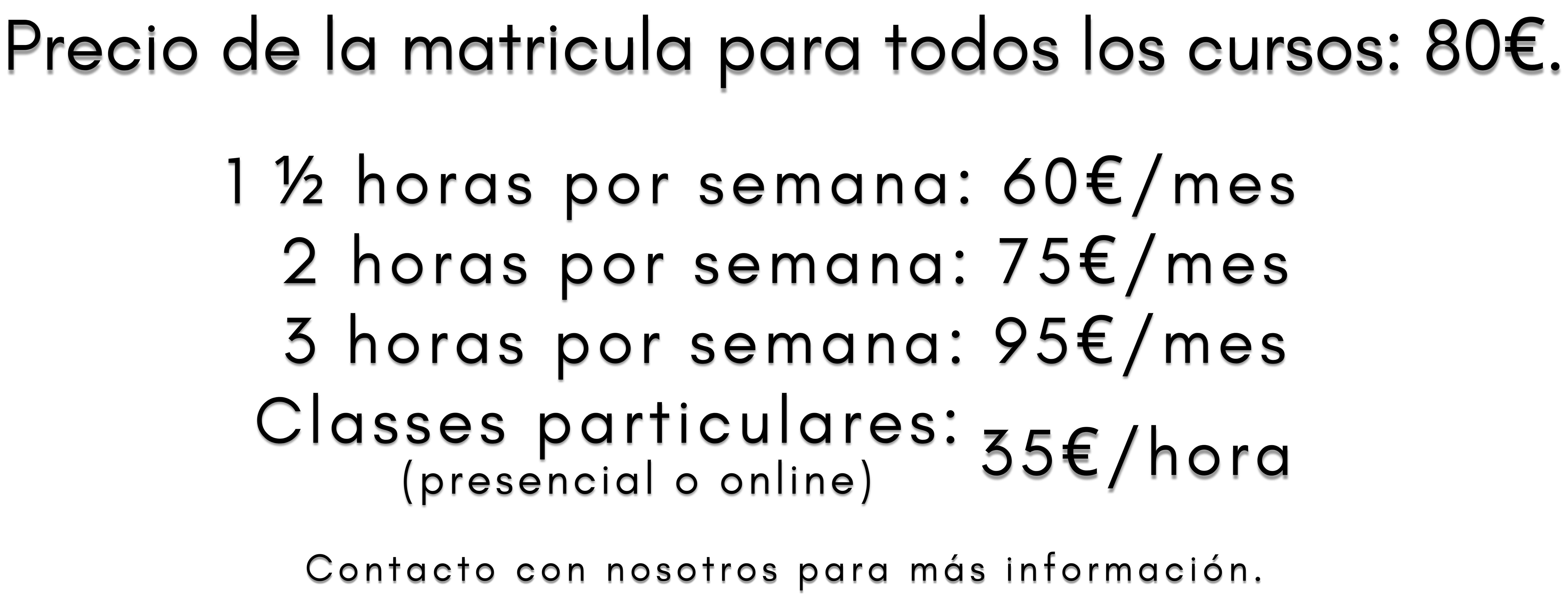 Nuestro objetivo es ofrecer una amplia variedad de cursos para nuestros estudiantes de acuerdo con la edad, el nivel y los objetivos. Desde grupos hasta clases privadas (precencial i/o online), proporcionaremos el curso que mejor se adapte a sus necesidades. Todos son bienvenidos desde jóvenes hasta mayores y de cualquier nivel. Nuestras aulas están bien equipadas y podemos adaptar nuestros métodos de enseñanza para cada alumno a través de material digital y audiovisual. Nuestro equipo profesional de maestros siempre está buscando formas innovadoras para motivar y alentar a los alumnos a alcanzar su potencial.